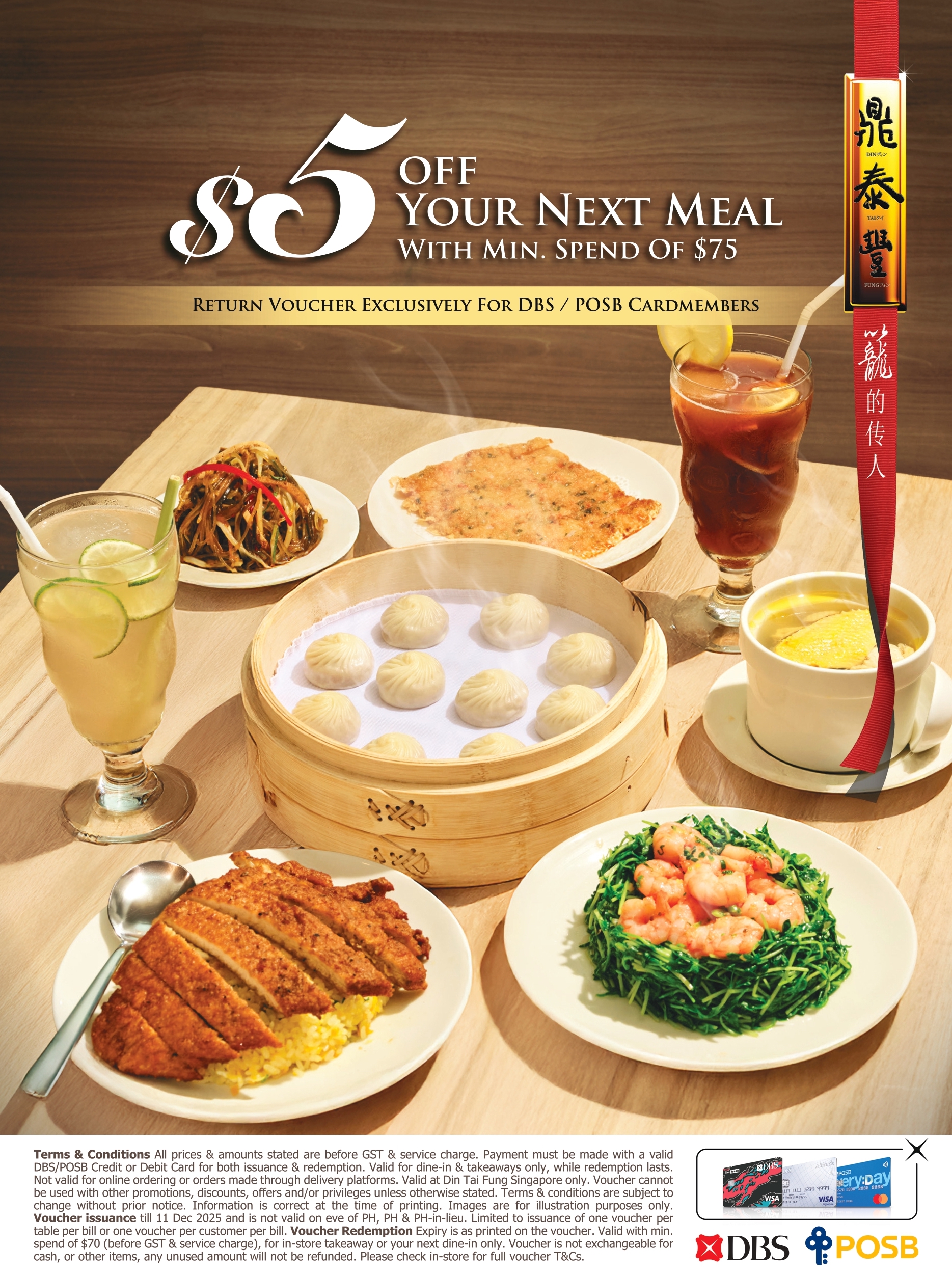 Exclusive to DBS Cardmembers, receive $5 off your next meal with min. spend of $75.