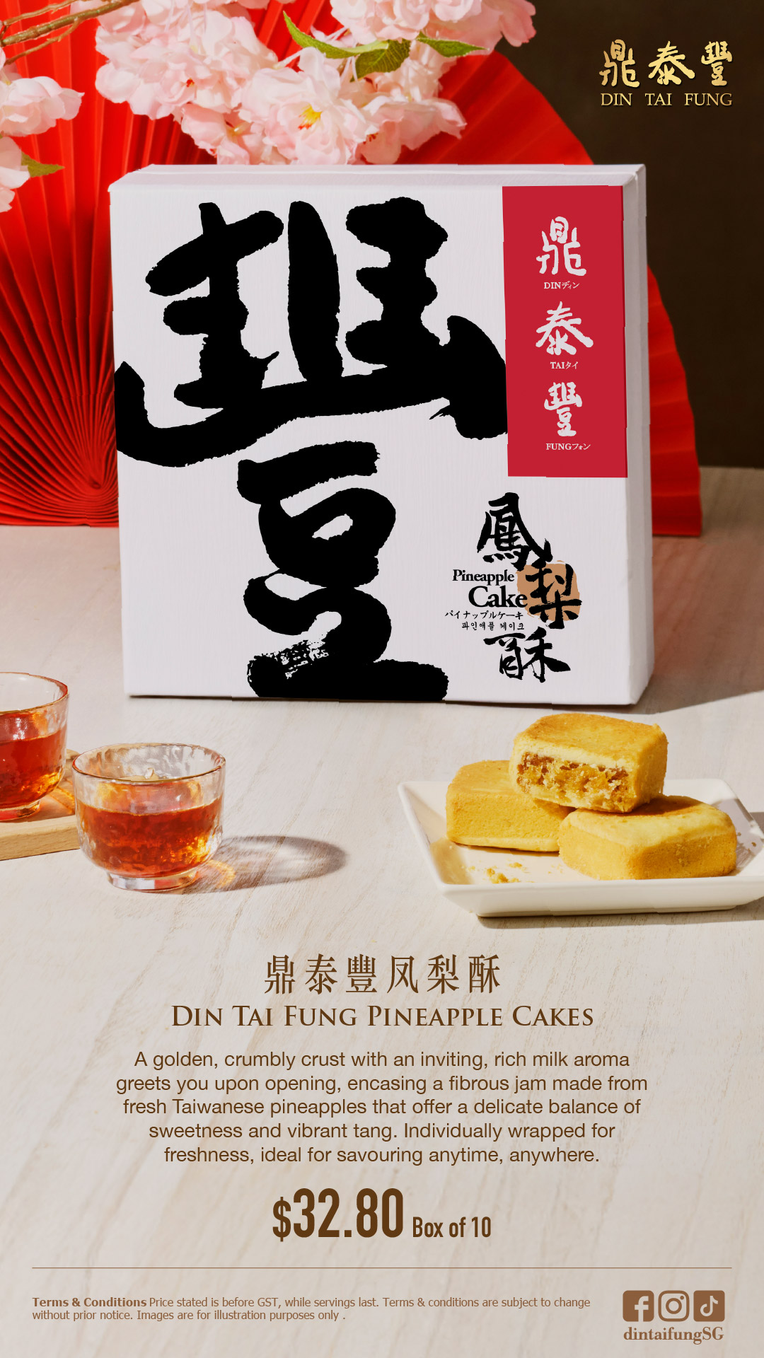 They are finally back — Din Tai Fung’s bestselling Pineapple Cakes! Made with natural Taiwanese pineapples and wrapped in a buttery crust, these crowd favourites are a sweet-tangy treat you won’t want to miss. Individually packed for freshness and flavour in every bite.